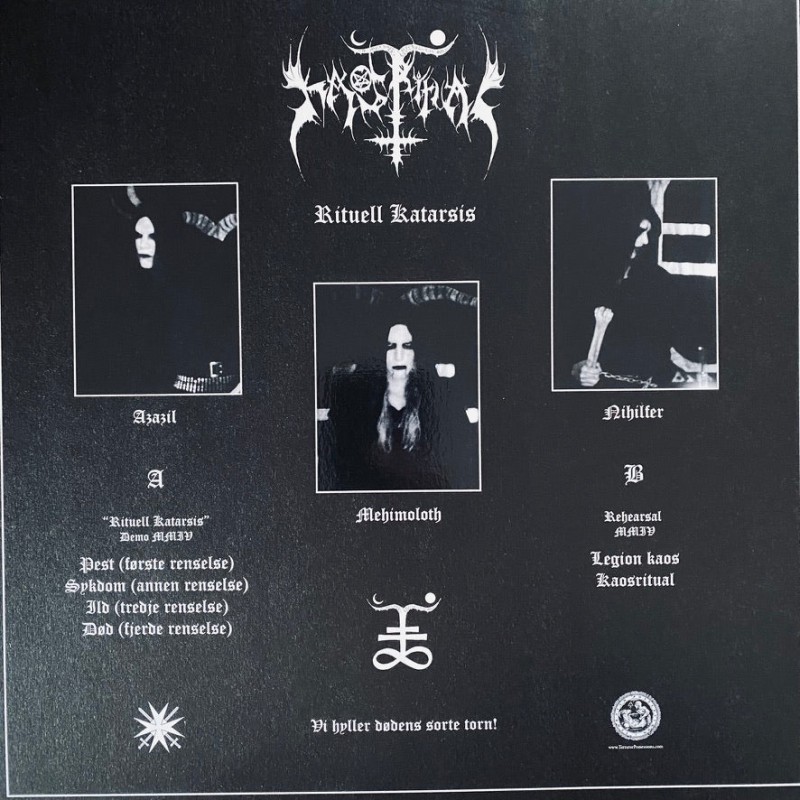 The band was founded, rehearsed and recorded based off our interpretations of early 90’s Black Metal. The era of murder, arson, Black Magick and spite. I firmly believe what you hear on these recordings, are the same chaos that fueled the originators, and is as genuine as the old classics. I was sitting right there alongside H. "Sarath" Dalen, while he recorded this on tape in the basement of our record store Apocalyptic Empire, in the heart of Nidaros back in 2005. Reminiscing back, I’ll never forget the intense atmosphere, dedication and focus the band had, something I’ve never experienced since, just like their live shows. Nothing will ever compare. The store was very much exactly what Helvete was in the 90’s: a record store ran by us for us, with a basement where recordings were happening non stop, even during the opening hours. The basement was a collective ground for us where lifelong friendships arose, parties ensued, and inspirations were endless. Imagine locking up a bunch of miscreants devoted to the same cause, with no boundaries, no thought or respect for anyone, just all focused on one thing: BLACK METAL. This was always for ourselves, hence why releases are so sporadic. I am truly grateful to not only having been there throughout the beginning, but to have been granted the exclusive right to release several of these gems, and to be able to call these genuine artists and individuals my close friends to this day.