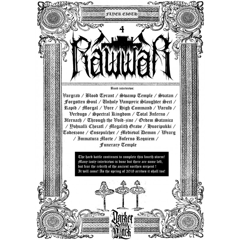 Pro-printed fanzine, 136 pages. Interviews with Vargrav, Blood Tyrant, Morgal, U.V.S.S., Ordem Satanica, Immatura Morte, Medieval Demon, Varulv, Vore, Spectral Kingdom, Ifernach, Todeszone, Swamp Temple, Svatan, Yohualli Checatl, Forgotten Soul, Funerary Temple, Megalith Grave, Inferno Requiem, Total Inferno, Rapid, High Command, Ensepulcher. Plus Reviews!