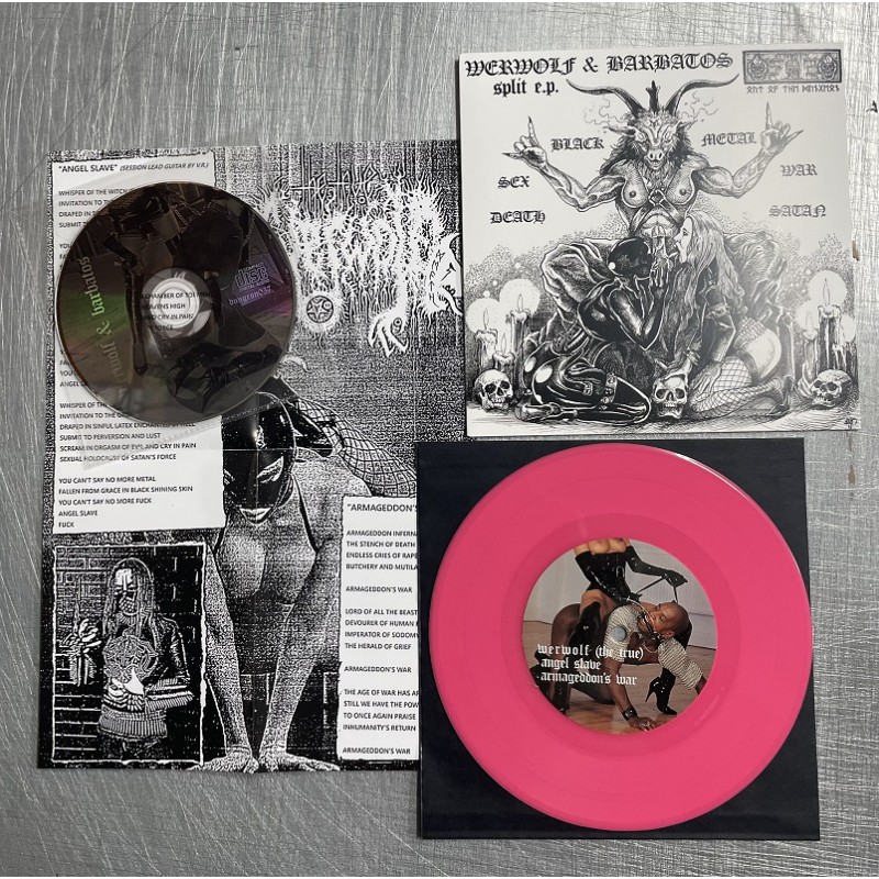 Graf Werwolf and Count Barbatos finally join forces on a split release! Four-song seven inch with eight minutes on each side + a bonus CD containing a collaboration work with both artists, overall the split contains 35 minutes of new music!